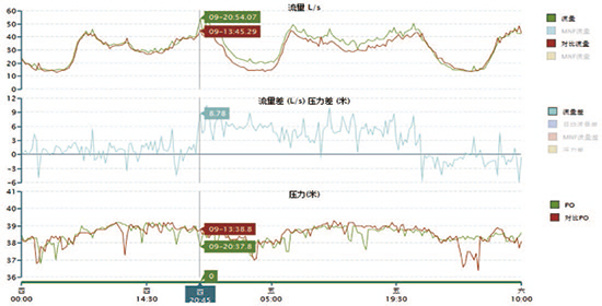 S区内*处DN150供水管道发生泄露,*后发展到爆管。通过对流量的监测和对比分析,及时发现了水量及MNF异常。
